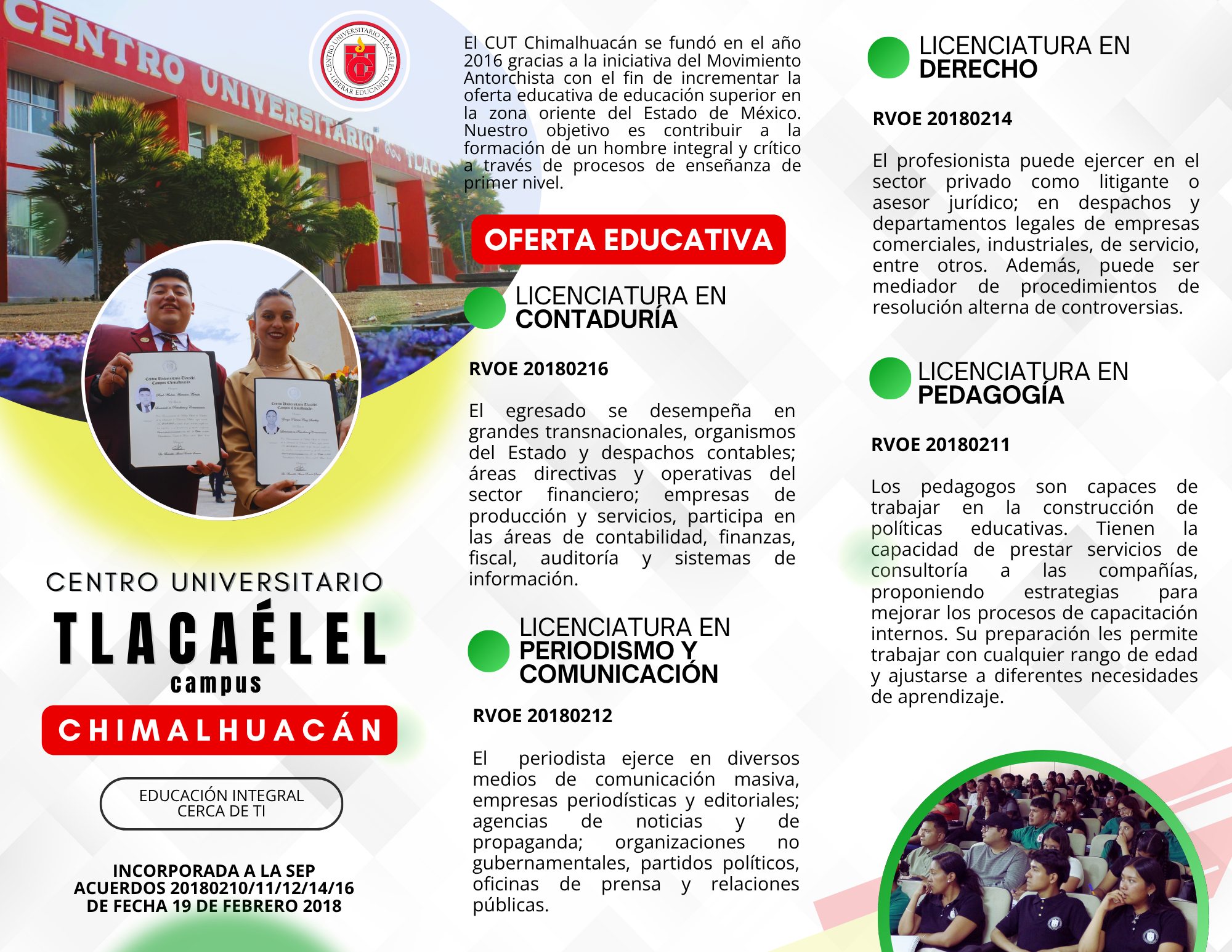 El Centro Universitario Tlacaélel (CUT) es una institución privada de educación superior, incorporada a la Secretaría de Educación Pública (SEP); y que cuenta con Reconocimiento de Validez Oficial de Estudios (RVOE).